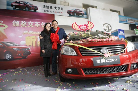 日前,长城公司在天津举行了 “腾翼C30新结婚时代”大奖的颁奖仪式,完成了新车交付手续。天津一等奖获得者高先生的作品发布于汽车之家,得到高达88321票稳居第一位,在新浪、腾讯平台上脱颖而出的一等奖获得者分别来自广州、西安,票数高达325483票、2153730票。接过象征的车钥匙,他兴奋地告诉记者:“感谢长城公司圆了我的汽车梦。正当我们筹办婚礼之时,长城汽车举办的“你结婚、我送礼”的新结婚时代活动,把腾翼C30送给我们,成为了我们的新婚礼物。我会认真记录使用经验,及时和大家分享。这款充满爱的车将成为我们美好婚姻的见证者,陪伴着我们以轻快的脚步奔向幸福。”