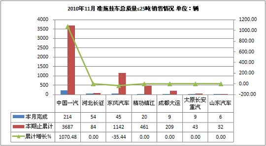 2010年11月半挂牵引车生产30693辆,累计生产336069辆,销售28277辆,累计销售334121辆。