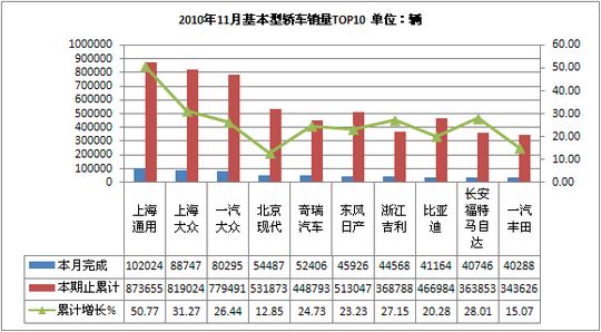 2010年11月基本型轿车生产941784辆,累计生产8570531辆,销售933897辆,累计销售8573504辆,同比累计增长分别为29.81%和28.94%。