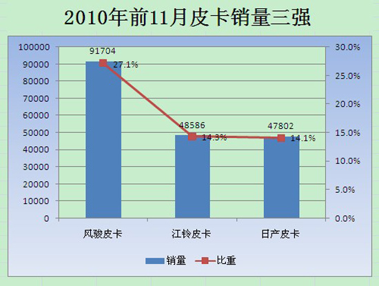 根据中汽协的统计,2009年全国汽车销量已逾1300万辆,而今年1-11月累计产销1639.54万辆,同比增长34.05%。其中受汽车下乡政策影响最大的微客,今年前11个月的增长相比去年80%的增长率虽有减缓,但是也一直维持在较高的增长速度。而同样具备补贴条件的皮卡车型,也顺利地度过了政策蜜月期,据统计2009年皮卡共销售25.58万辆,同比增长达29%。2010年1-11月份登记在册的皮卡品牌累计销量338974辆,同比增长49.3%。其中风骏皮卡以91704辆名列榜首,而前10月已经完成了去年全年的销售总合,占整个皮卡市场份额的27.1%。