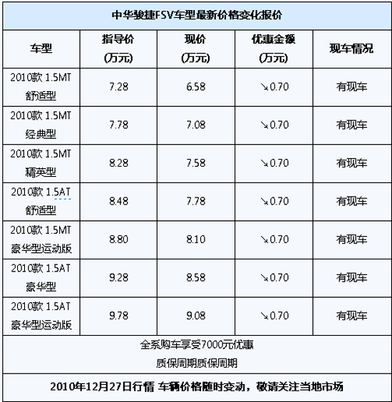 编辑从上海华星鸿华4S店了解到,中华骏捷FSV2010款在沪有现车,价格方面有7000元的优惠让利,含3000元惠民补贴。详细车辆信息和价格请见下表: