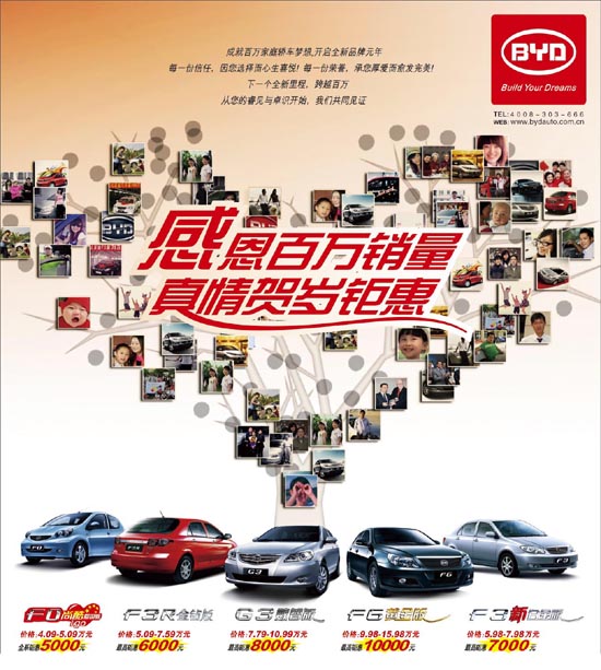 在众多的优惠信息中,优惠时间最长,优惠幅度最大的当属比亚迪的“感恩百万销量 真情贺岁钜惠”活动。12月10日至2011年1月20日之间长达40天的“感恩钜惠”活动,确实给年末有购车意愿的消费者带来了不错的选择。