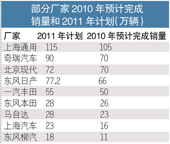 从公开的数据来看,今年厂家相对保守,多数目标在增幅10%。其中上海通用在2010年12月22日年销量达到103万辆,预计全年将超过105万辆,但总经理丁磊接受采访时称,今年的产销目标115万辆,增幅不到10%左右。而近两年增速一直很快的北京现代目前销售目标只是72万辆,比去年的增幅只增长区区3%。同样保守的还有东风本田,28万辆的销量仅比去年增幅不到8%;而饱受“召回门”之苦的一汽丰田今年的计划销量为55万辆,增长10%。在主流合资企业中,拿得出手的要算东风日产,77.2万辆的销量目标同比去年66万辆增幅要超过10%。