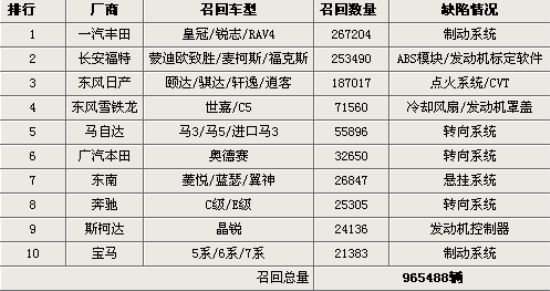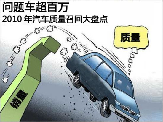而在国内从2010年1月至今一年的时间里,几乎每隔一段时间就有一次来自汽车厂家的召回公告,召回汽车的总量近100万台,其中一汽丰田与长安福特召回超过20万辆车。东风日产的热销车款骐达、颐达、轩逸和逍客也经历了召回,总量也达18万之多。不过也有没有进入排行前十的厂商,但却经历了多次召回,比如沃尔沃、东南、捷豹、Jeep等厂商,在今年因不同质量问题多次召回车辆。由此不难看出,汽车质量召回已经大规模爆发,涉及的厂商也非常之多,数量也再创历史新高。值得关注的是自主品牌因质量召回的不多,不知是它们真的技术过硬还是另有隐情。