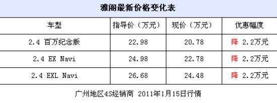 近日,编辑从广州地区广汽本田4S经销商处了解到,目前雅阁的优惠幅度较之前有所增加,现在购买2.4L车型可现金优惠2.2万元,店内有现车,购车可获千元礼包。以下是雅阁最新价格变化表: