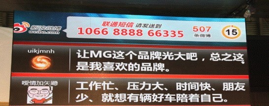 MG3犹如一块强力磁石,紧紧吸住了人们的目光。,此次车展MG还和新浪微博合作做微博上墙活动,只要发送短信到固定号码,你的评论就会出现在车展现场的大屏幕上,更有机会可以赢取MG的神秘礼品,很难不让人心动啊!你也在现场吗?不妨与我们分享你与MG3邂逅的美好故事吧!