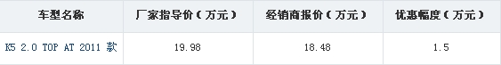 价格波动情况:东风悦达起亚K5刚刚上市,销量一直不错,几乎没有现金形式的优惠,庞大龙华庆本次车展购车优惠1.5万,是这款车首次现金优惠。