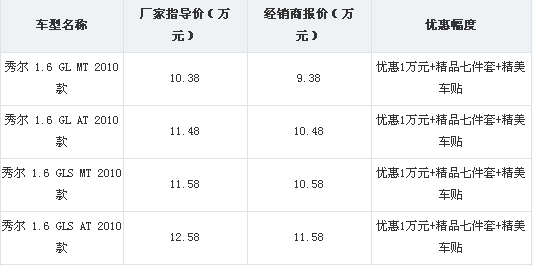 价格波动情况:秀尔在沈阳地区优惠力度比较平稳,之前都是仅送七件套,目前再优惠1万元现金以及赠送厂家推出的精美车贴,车源也比较充足。