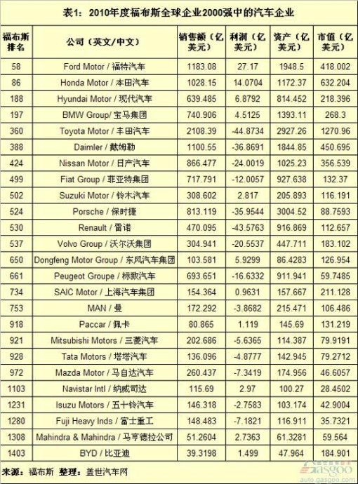 2010年度福布斯全球企业 2000强中的汽车企业(25家)比2009年度的(29家)少了4家——大众、通用以及俄罗斯的两家车企伏尔加汽车制造厂和高尔基汽车厂没能登上2010年度福布斯全球企业2000强。