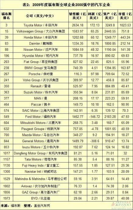 与2009年度相比,2010年度汽车企业在福布斯全球企业2000强中的排名大都有所下降。比如,丰田由2009年度的第3名降至第360名,本田由第39名降至第86名,保时捷由第267名降至第524名,雷诺由第350名降至第530名。