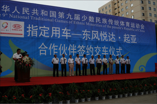 8月11日,第九届全国少数民族传统体育运动会指定用车签约交车仪式,在省政府大院内隆重举行。现场进行了120台指定用车-东风悦达起亚K5的交接。其中,70台代表团接待用车、30台组委会工作用车和20台火炬传递用车。省领导及第九届民族运动会各部门的领导、东风悦达起亚厂家领导代表、贵州华通汽车代表出席签约交车仪式。