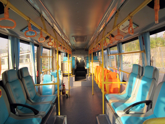 五洲龙FDG6121FCEV型燃料电池大巴从外观上来讲,与普通城市客车没有明显差别,只是车顶上扣了一顶“皇冠”,此为氢气瓶装饰罩,整车为方基调造型,采用钻筒水晶整体式前大灯,LED高亮度长寿命低能耗转向灯。乘客区布置30座软面公交座椅,保洁方便,乘座舒适。两条内嵌式长条型LED顶灯贯穿前后,让夜晚的车厢明亮如昼,浅蓝色窗帘与座椅面料协调统一。
