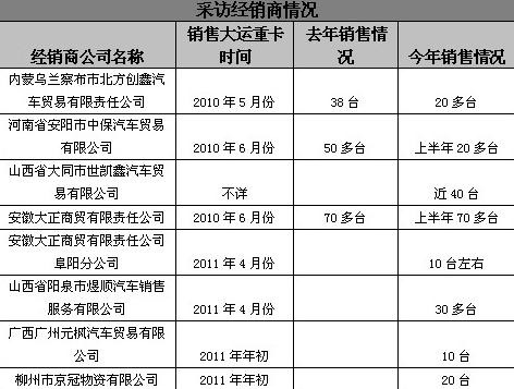 (根据记者随机采访的列表情况分析,在采访的8家经销商中,有3家是去年就开始销售大运重卡,有4家是今年开始销售大运重卡,一家销售大运重卡的具体时间不确定。2011年新进入的大运重卡经销商数量占据了被调查经销商数量的一半。这意味着新增加的经销商销售重卡的数量是大运重卡今年销量的一个增长点。