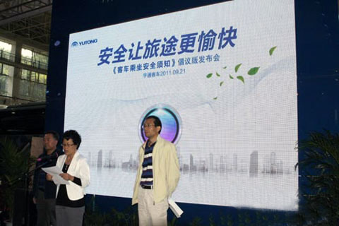 9月21日,在2011年中国(武汉)国际交通运输科技博览会上,宇通客车发布了精心制作的客车乘坐安全须知片倡议版,该片通过对一系列客车乘坐安全须知和突发情况应对方法的讲述,提醒乘客如何在乘车过程中规避危险,以及在遇险情况下如何采取有效、正确的自救方式。据悉,宇通此后推出的所有客车都将安装这个视频。不仅如此,宇通呼吁中国所有的客车都能安装这一视频,届时,所有客车的乘客都能够在乘车时学习到如何应对乘车过程中的突发情况,这将有助于降低客运行业安全事故导致的人员伤亡率。