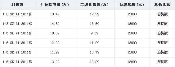 日前,编辑从沪上二级经销商处了解到,雪佛兰科鲁兹在二级经销商中的优惠幅度保持平稳,现在科鲁兹现金优惠已达1.2万元。除了现金优惠以外,经销商还赠送精美装潢大礼包。具体降价明细如下表: