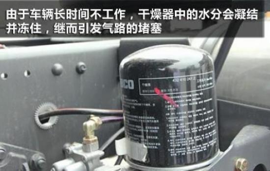 在启动车辆之前,应检查干燥器中凝水是否冻住,必要时要用火烤解冻,以免让整个气路发生堵塞,倘若气路堵塞,检查刹车是否回位不畅,避免刹车抱死。
