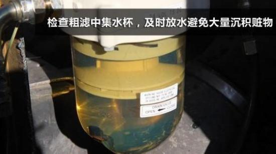 由于车辆在停放长时间后,油箱中柴油沉淀的赃物质会大量沉淀,着车后会全部抽出,并且会经过粗滤,所以要检查粗滤中集水杯,及时放水避免大量沉积。