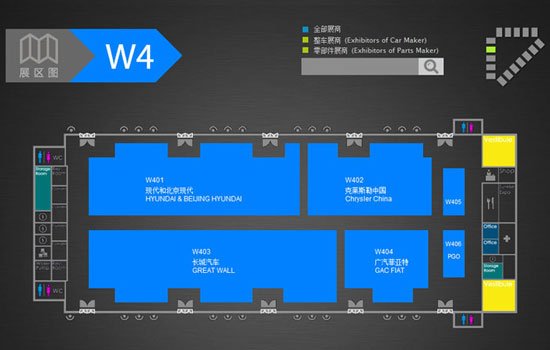W4号馆: 整车,包括现代和北京现代、克莱斯勒、长城、广汽菲亚特、PGO等;