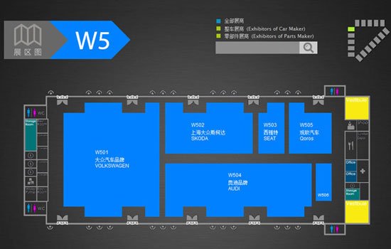 W5号馆: 整车,包括大众、斯柯达、西雅特、奥迪、观致等;