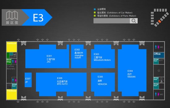 E3号馆: 整车,包括江淮、昌河铃木、三菱、日产、启辰、比亚迪、ZF等;