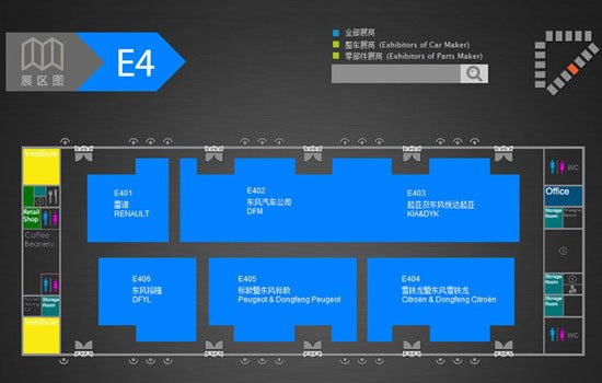 E4号馆: 整车,包括雷诺、东风、起亚及东风悦达起亚 、雪铁龙暨东风雪铁龙(微博)、标致暨东风标致、东风裕隆等;