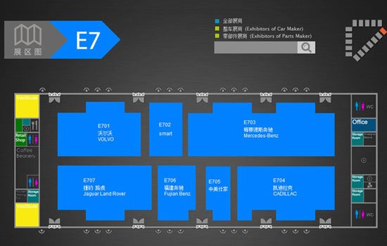 E7 号馆: 整车,包括沃尔沃、SMART、梅赛德斯-奔驰、凯迪拉克、中美仕家、福建奔驰、捷豹、路虎等