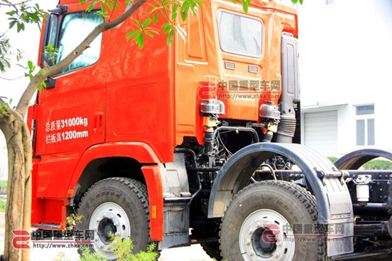 驾驶室侧面设计风格很有欧洲风格,车门下沿将登车踏板包覆,仅露出最下面的第一集踏板,防止有人扒车的同时减少风阻。可以很清楚的看见在车门后面有个储物格,虽然是工程车底盘跑长途的机会不算多,但多了这样一个储物格放置一些随车工具还是非常方便的。车门上的总质量说明该车允许总重31吨,而栏板高1200mm很明显是一辆自卸车的栏板高度。