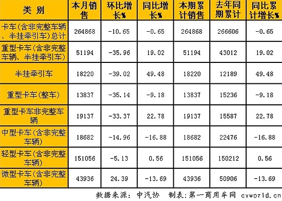 中型卡车(含非完整车辆)销售18682辆,环比下降14.96%,同比下降16.88%;轻型卡车(含非完整车辆)销售151056辆,环比下降5.13%,同比微涨0.56%;微型卡车(含非完整车辆)销售43936辆,环比增长24.39%,同比下降13.69%。