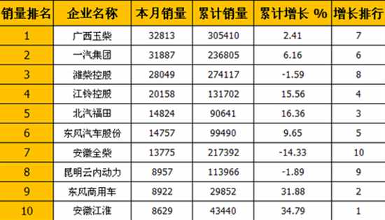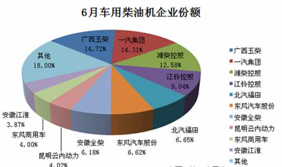 2014年6月份,车用柴油机销售222878台,销量排名前十的企业共计销售182771台,占据整个车用柴油机市场总销量82.00%的份额。排名如下: