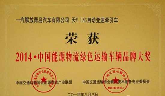 2014年8月8日,第四届中国能源物流产业大会在北京隆重举行,本次会议有中国交通运输协会主办、中国煤炭运销协会等单位协办,以“构建大基地大通道 打造中国能源物流升级版”为主题,旨在通过会议讨论和交流当前我国能源物流发展过程中所面临的热点难题,推动我国能源物流产业有序发展。会上,一汽青岛天V-LNG卡车作为会议主办方中国道路运输协会重点推荐的新能源车型,得到了到会嘉宾的一致好评,并被评选为“中国能源物流绿色运输车辆品牌大奖”。