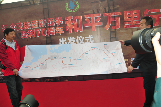 在活动启动仪式上,主办单位向公众正式公布了本次活动供沿途民众签名的全程地图,以及代表中国文化的和平友好之印。这些印章以各国首都的中文名称和当地文字为主图案,分别代表中国文化与沿途各国文化交流之意。宋敬武主任等领导在地图上签名并为参加活动的各界代表授旗,最后全体参与活动的企业家等一起宣誓:牢记历史,珍惜和平,忠实记录,认真传播。