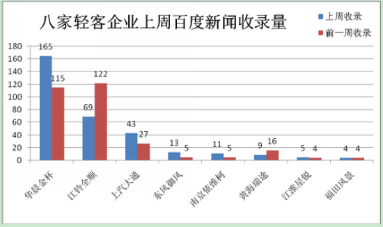 上周,八家轻客企业共计有150条实际相关新闻(不计转载,数据来源:百度新闻收录和第一商用车网等三家专业网站),319条百度新闻收录(计入转载数),20条门户网站新闻收录(腾讯、新浪、网易、搜狐和凤凰),122条专业网站新闻收录(第一商用车网、方得网和汽车之家)。