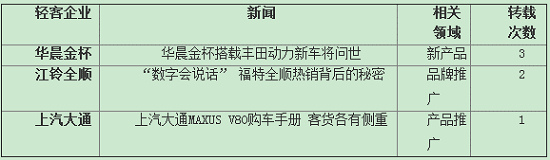 其中,实际新闻发布量最多的三家企业分别为:华晨金杯(52条)、江铃全顺(50条)、上汽大通(21条);百度新闻收录量排名前三的企业为:华晨金杯(165条)、江铃全顺(69条)、上汽大通(43条);门户网站新闻收录量排名前三的企业为:华晨金杯(6条)、江铃全顺(5条)、上汽大通(5条);被第一商用车网等三家专业网站收录新闻最多的企业为:华晨金杯(48条)、江铃全顺(45条)和上汽大通(12条)。