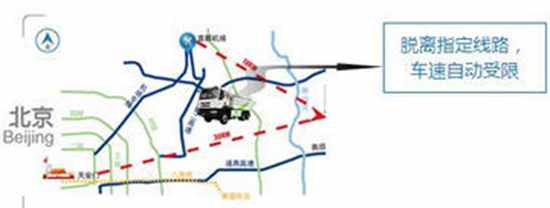 车辆办理运输核准证以后,运输线路自动输入北斗终端,一旦行驶中离开指定线路,发出语音提示,行驶速度自动受限。回到正确线路后,自动恢复正常。该功能可防止渣土车不按规定线路行驶,便于政府监管。