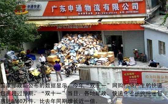 国家邮政局公布的数据显示,今年“双十一”网购促销产生的快递包裹超过预期,“双十一”当日,各地邮政、快递企业揽收快递包裹达8860万件,比去年同期增长近一倍。