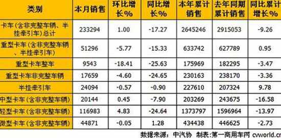 由上表可见,环比9月,卡车各细分车型除中型卡车和轻型卡车销量有所增长,其他细分车型全部呈下降趋势。与去年同期相比,除微型卡车同比微增1.28%,其他车型全部出现下滑。重型卡车整车、重型卡车非完整车辆和轻型卡车(含非完整车辆)的降幅都超过了20%。