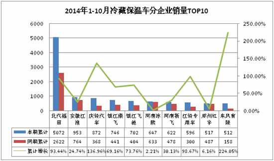 2014年1-10月冷藏保温车销量前十名的企业分别是北汽福田、安徽江淮、庆铃汽车、镇江康飞、镇江飞驰、河南冰熊、河南新飞、江铃专用车、郑州红宇和东风有限。北汽福田无疑是冷藏保温车的领军企业,累计销量5072辆,累计增幅93.44%。冷藏保温车前十家企业中均出现累计销量增幅,其中以庆铃汽车和东风有限增幅最大,分别为136.96%、224.05%。河南冰熊销量增幅最小,仅有2.21%。