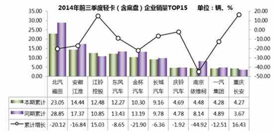 2014年1-9月,轻卡市场惨淡,轻卡(含底盘)累计销售1259145辆,同比增长-12.66%,降幅持续扩大。 主要原因是今年4月中旬工业和信息化部出台的2015年起开始实施国四排放标准,排放升级需额外费用,较之前的轻卡价格高出不少,这是首当其冲的原因。另外,一些地区存在套牌现象,使得检察部门严格检验轻卡产品,从而使轻卡销量全面下降。其他还有一些用户为了节省费用而选择低速货车也有一定关系。