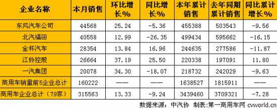 销售情况分企业看,11月份销量排名前5的商用车企业依次为:东风汽车公司、北汽福田、金杯汽车、江铃控股和一汽集团。5家企业11月份共销售160222辆,占11月份商用车总销量(315563辆)的50.77%。