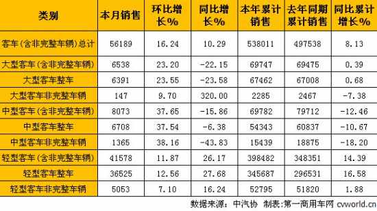 其中,大型客车(含非完整车辆)销售6538辆,环比增长23.20%,同比下降22.15%;中型客车(含非完整车辆)销售8073辆,环比增长37.65%,同比下降15.86%;轻型客车(含非完整车辆)销售41578辆,环比增长11.87%,同比增长26.17%。