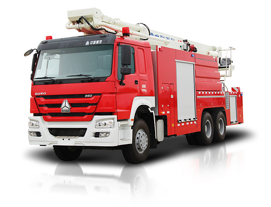 该车由中联重科有限公司研制生产,型号为ZLJ5320JXFJP32,水箱容量5000L,泡沫罐容量为2000L,泵压为1.5Mpa。最大作业高度32米,有效射程80米,其举高喷射系统为机械驱动、全回转、折叠臂式,具有功率大、射程远、载水量大、操作简便、动作灵活、安全可靠等优点,可供消防人员扑救高层建筑、大跨度、大空间厂房等场所火灾,适应了新形势下灭火救援作战需要。