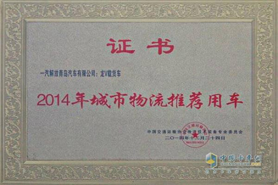 2015年1月23日,由中国交通运输协会主办的“第四届中国城市物流发展年会”在武汉市隆重召开,本次会议以“新常态下,城市发展的机遇与变革”为主题。一汽青岛龙V载货车凭借经济、可靠、高效的产品特质,得到到场专家的一致好评,荣获“2014年城市物流推荐用车”称号。