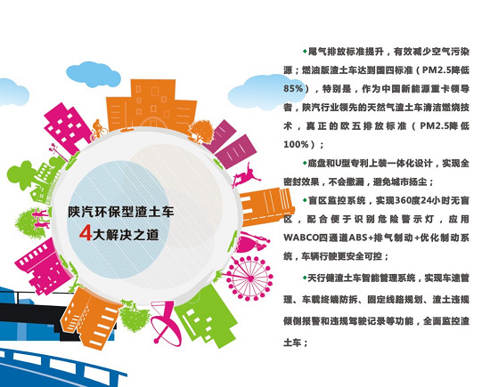 陕汽根据雾霾天气对城市环境危害,针对老式渣土车“抛、洒、遗、漏”的弊端,开发出新型环保、智能、安全渣土车,该车是基于行业现状,根据国四排放法规要求,利用天行健智能管理系统开发的车型,具有排放低、密封严、无抛洒、无遗漏、不积土、管理细、无盲区、安全性高等特点,并为客户提供6大综合解决方案。目前已在北京、上海、湖南、山东、河南、浙江等省市批量投入使用,重新定义城市渣土车新标准,成为拨雾去霾的城市大使。
