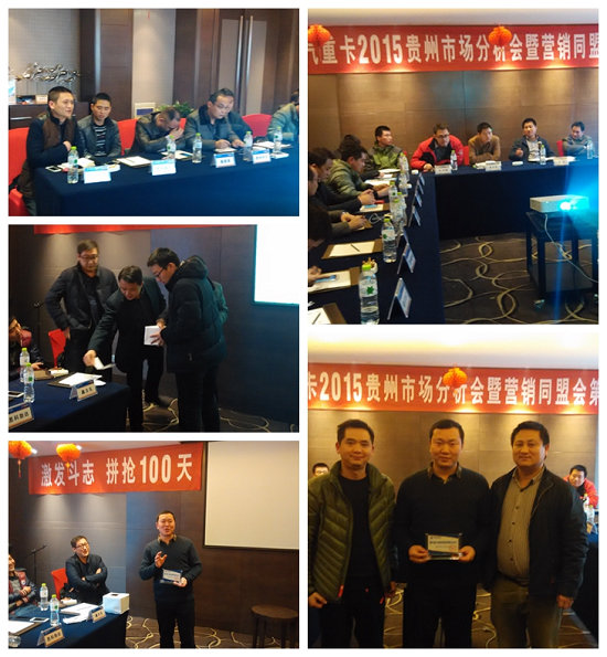 最后,贵州办事处主任刘龙做了总结发言,他强调:2015年贵州市场主流产品配置不变,仍是340马力EGR+12档变速箱;经销商团队更加成熟,营销队伍有大步提升;贵州资源准备充足,完全可以应对资源型市场旺季的需求,比竞品储备更具优势;团队依然保持积极高涨的营销激情,办事处全员自信满满;服务渠道受理后,在服务意识、服务态度、服务硬件、销服协同等方面有明显提升,一旦市场需求好转,贵阳办事处储备的国三上户必定会成为我们抢夺2015年贵州市场的制胜法宝。