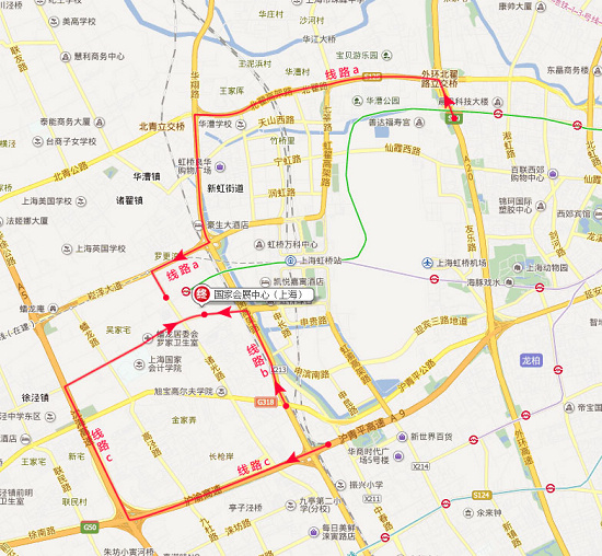 线路1:国家会展中心 → 9号线中春路(30辆)线路2:国家会展中心 → 10号线虹桥机场T1航站楼(30辆)线路3:国家会展中心 → 13号线金运路(30辆)2. 驾驶私家车(1)由于国家会展中心停车位有限,主办方建议将车辆停放在上海车展指定停车场,以免因展馆周边无停车位而给您带来不便。在较远的停车场,主办方将安排短驳班车接送。上海车展指定停车场信息(见下图)
