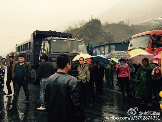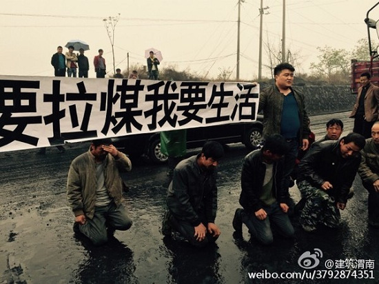 2015年4月18日下午,陕西韩城,多名拉煤司机被困在韩城市桑树坪镇雷岭村,当地村民阻拦了他们的去路。在雨中,拉煤司机拉出横幅并下跪求村民放行。据了解,当地有一个矿井,最近一个公司的车队通过招标后和矿井签订了协议,负责运输煤矿。可是当地的村民认为,车队较低的价格影响他们去矿井拉活儿,所以就让一些老人和妇女堵着路,不让车队经过拉煤。目前,经过民警做工作,村民已经离去,拉煤车辆均已逐一通过。图为司机下跪现场。