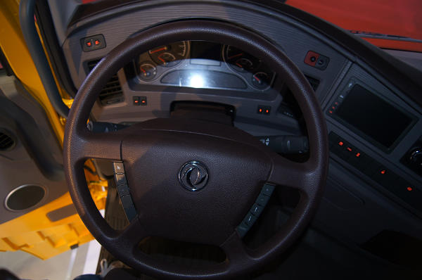 整体内饰以灰色和棕色为主,四辐式方向盘带多功能键,仪表台带多功能液晶屏及自动空调。中间空调出风口上方带有可滑出的承载小板,提供司机在用餐时一个放置点。