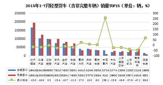 2015年7月国内轻型货车产量93225辆,累计产量920732辆,同比下降5.41%,累计增长-12.80%;本月国内轻型货车销量102623辆,累计销量917171辆,同比增长-7.62%,累计增长-13.00%。其中,北汽福田累计销售轻型货车166430辆,排名第一,累计下降15.0%;累计销量前十五名中,中国重汽销量增幅最大,增幅超过250%,累计销量为32734辆。
