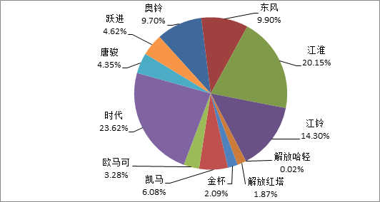 2015年1-7月主流轻卡品牌共销售轻卡428477辆,其中销售前三名的品牌轻卡分别是时代、江淮和江铃,销量分别为101199辆、86331辆和61289辆。