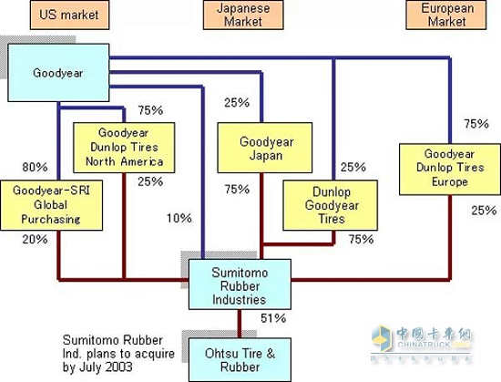 固特异与住友橡胶于1999年成立全球联盟。该联盟主要由四家合资经营企业组成,北美和欧洲各一家,日本两家。